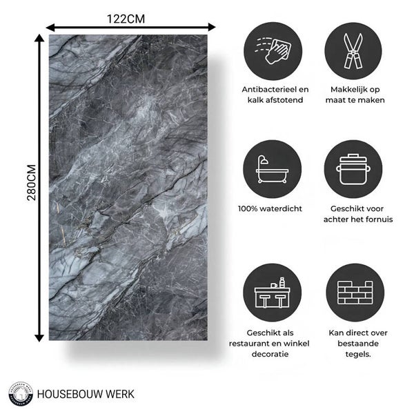 Ideaal voor badkamers, keukens, woonkamers, showrooms en commerciële ruimtes. De Grigio Imperiale Glans geeft een luxe en glanzende marmerlook – zonder de hoge kosten en het onderhoud van echt marmer.