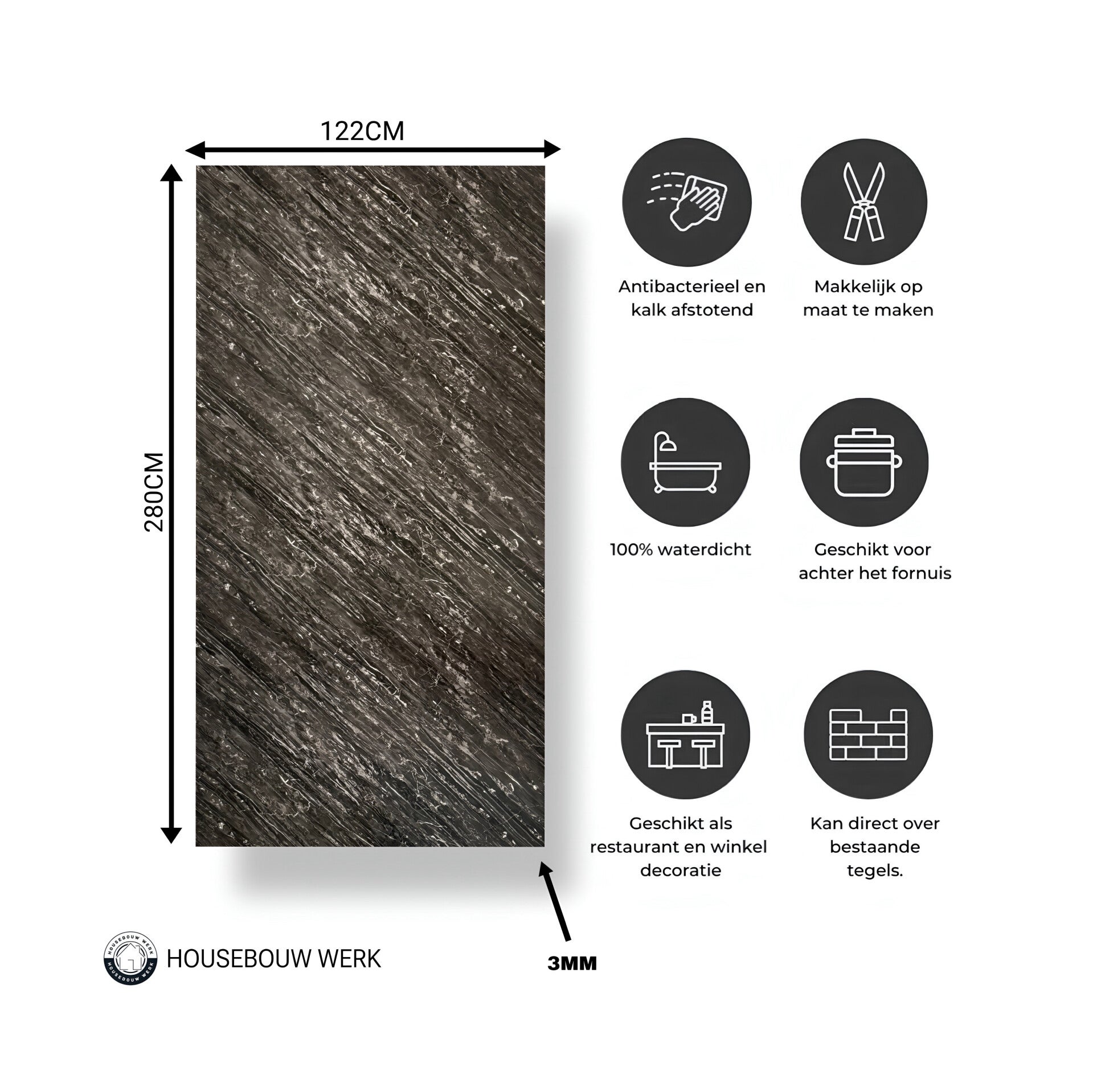 Het paneel is bestand tegen krassen, vocht en bacteriën, waardoor het zeer geschikt is voor keukens, badkamers en andere vochtige of intensief gebruikte ruimtes zoals horeca of zorgomgevingen.